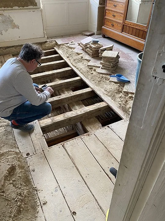 Far off, over that way, on the ground floor, in the southern corner of the Château lies the “la chambre d'honneur” - the bedroom of honor. I am not actually sure if this room was originally intended as a guest room but more as a receiving room. I suppose one always needs a receiving room which is adjacent to the Grand Salon, heaven forbid that you receive your morning guests in the Salon. Suffice it to say that la chambre d'honneur has been a guest bedroom for a very long time. Up until a few weeks ago it was a guest room with a questionable floor. Out of necessity we had lain a large carpet across its floor, a floor that was heading south into the depths of unknown. “Welcome to your room for the night, please step lightly and quickly across the floor as we know not what lies beneath”. A local team of Artisans known as COLB La Coopérative Ouvrière Lomagnole du Bâtiment, have tackled this floor of mystery, and much has been revealed. To begin sections of the oak surface were carefully removed and an examination of the boards proved most intriguing. Much of the parquet had been thinned down on each end to match the thickness of other oak floor boards in the room, leading to a theory that a great many of the surface boards were repurposed from a much older floor. Mister Holmes has surmised that these floorboards are part of a floor from the original Château and are in the neighborhood of 700 years old… cool!